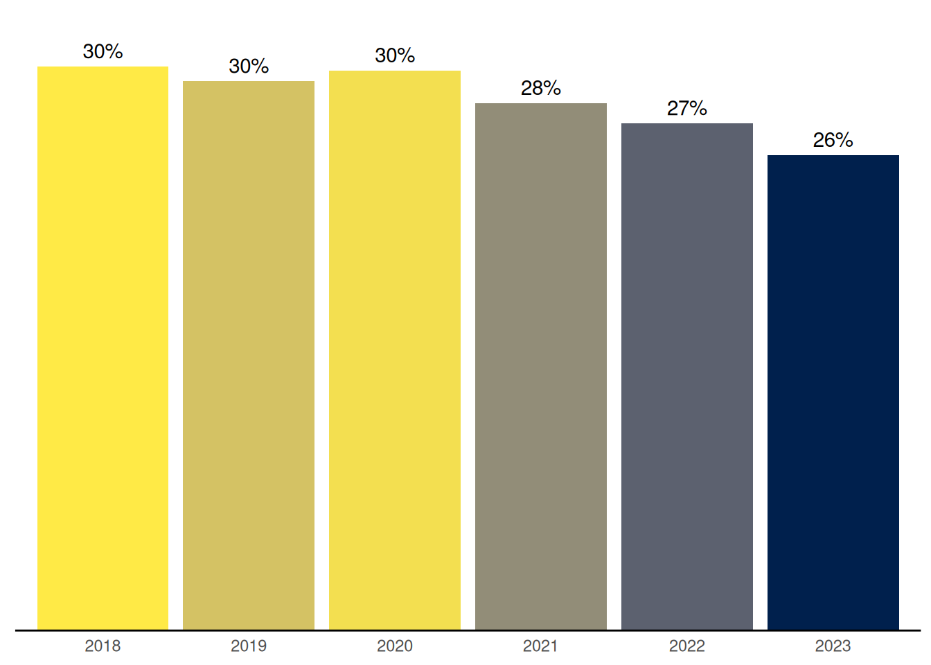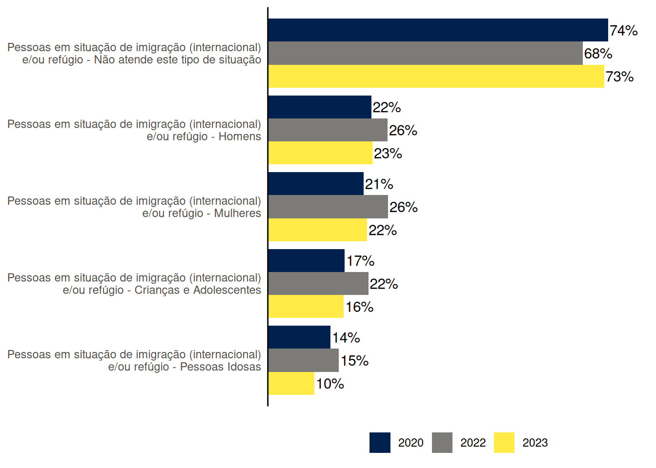 Os percentuais de CREAS que realizaram atendimento do PAEFI para pessoas em situação de imigração (internacional) e/ou refúgio reduziram em 2023 em relação a 2022 (Gráfico 4.7).