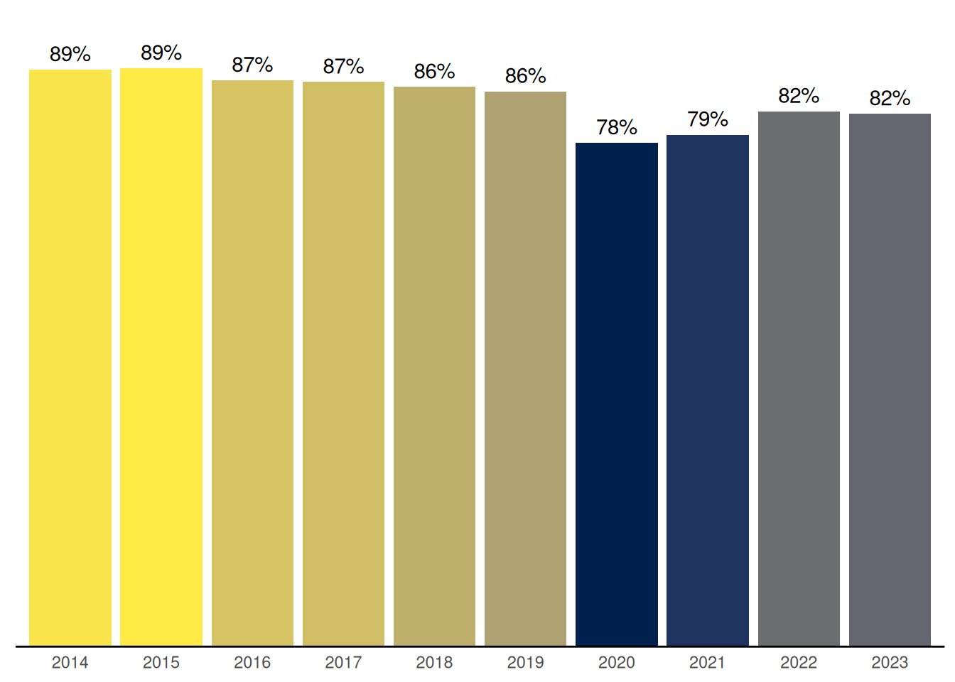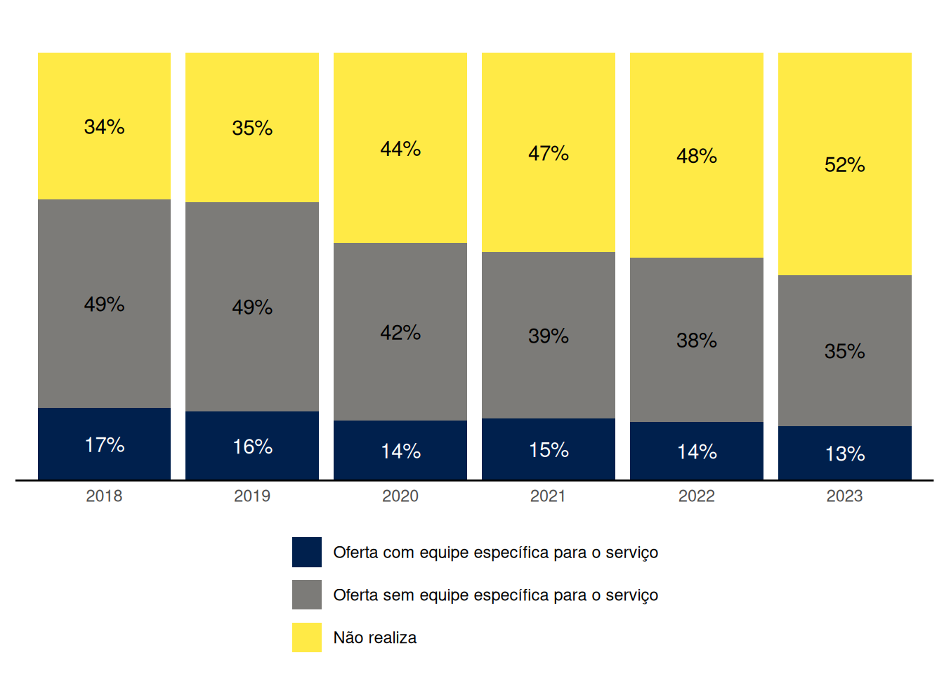 O Gráfico 4.3 mostra o percentual de CRAS que executam diretamente os Serviços de Convivência e Fortalecimento de Vínculos. Em 2023 registrou-se a manutenção do percentual de 2022, quando 82% dos CRAS relataram executar diretamente este serviço. Percebe-se na série histórica, começando em 2014, uma tendência de redução gradual do percentual de CRAS que executam diretamente o SCFV, exceto pelos anos de 2021 e 2022, quando houve uma recuperação após uma queda acentuada em 2020, ano da pandemia de COVID-19. Vale lembrar que o SCFV pode também ser ofertado nas Unidades de Centro de Convivência.