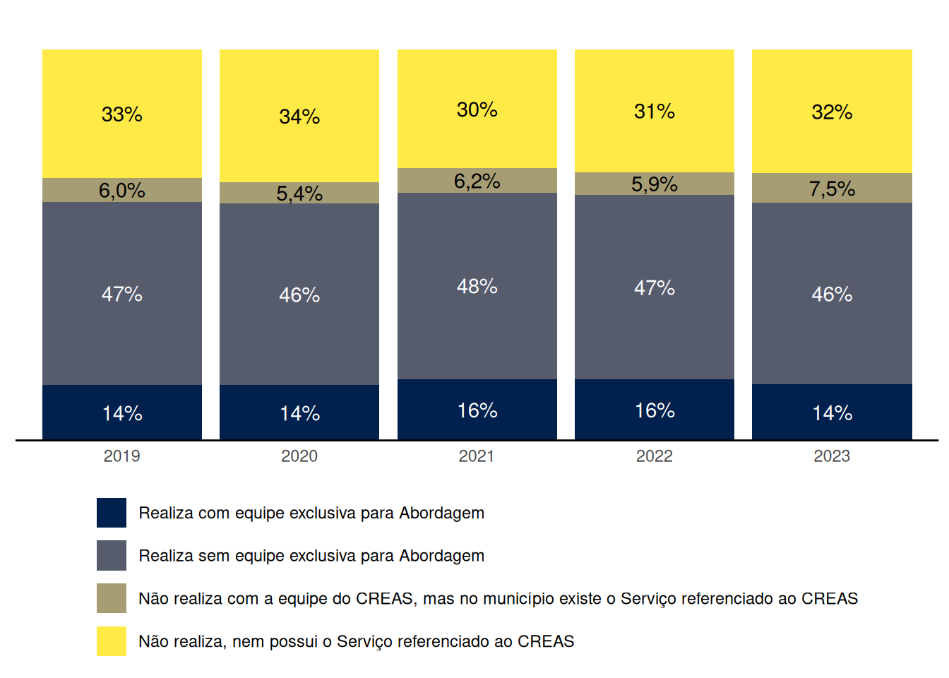 Os percentuais de CREAS que realizaram o Serviço Especializado em Abordagem Social, mostrados no Gráfico 4.11, permaneceram relativamente estáveis de 2019 a 2023, com pequenas oscilações.