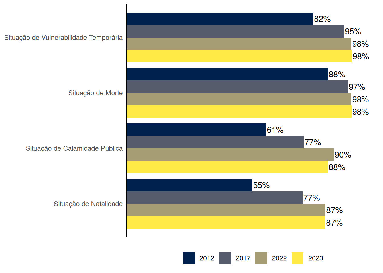Observamos no Gráfico 4.13 que em 2023 se manteve o percentual de Municípios de 2022 que concediam Benefícios Eventuais, exceto em situações de calamidade pública, em que houve um recuo de 2 pontos percentuais.