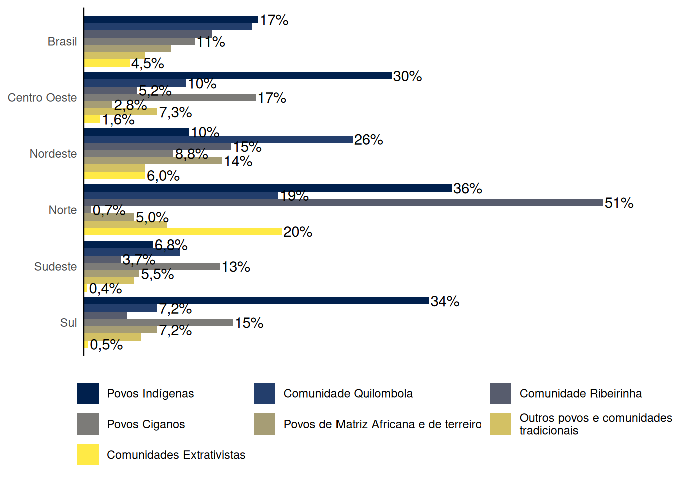 Logo em seguida observamos as Comunidades Quilombolas, puxado pelo alto percentual de CREAS que os atenderam na Região Nordeste (26%).