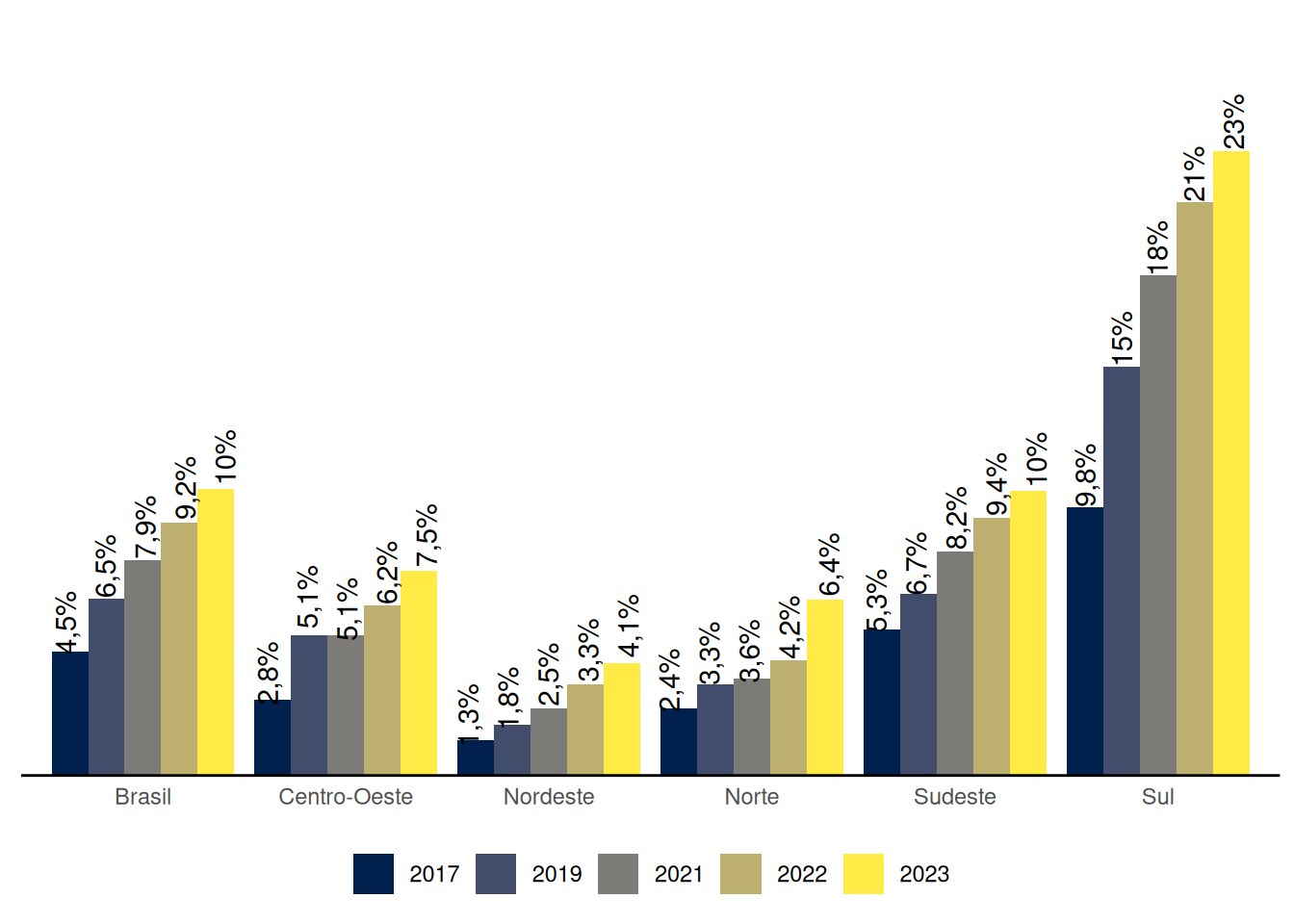 O Gráfico 4.12 mostra um contínuo crescimento do percentual de Municípios com unidades municipais executoras do Serviço de Acolhimento de Família Acolhedora, chegando a 10% dos Municípios brasileiros em 2023, com destaque para a Região Sul, cujo percentual chegou a 23%.