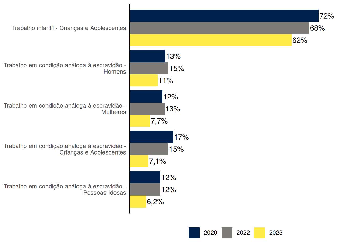 O Gráfico 4.6 mostra os percentuais de CREAS que realizaram atendimentos do PAEFI em situações de trabalho em condição análoga à escravidão e de trabalho infantil. Os percentuais de CREAS que realizaram atendimentos nestas situações caiu em 2023.