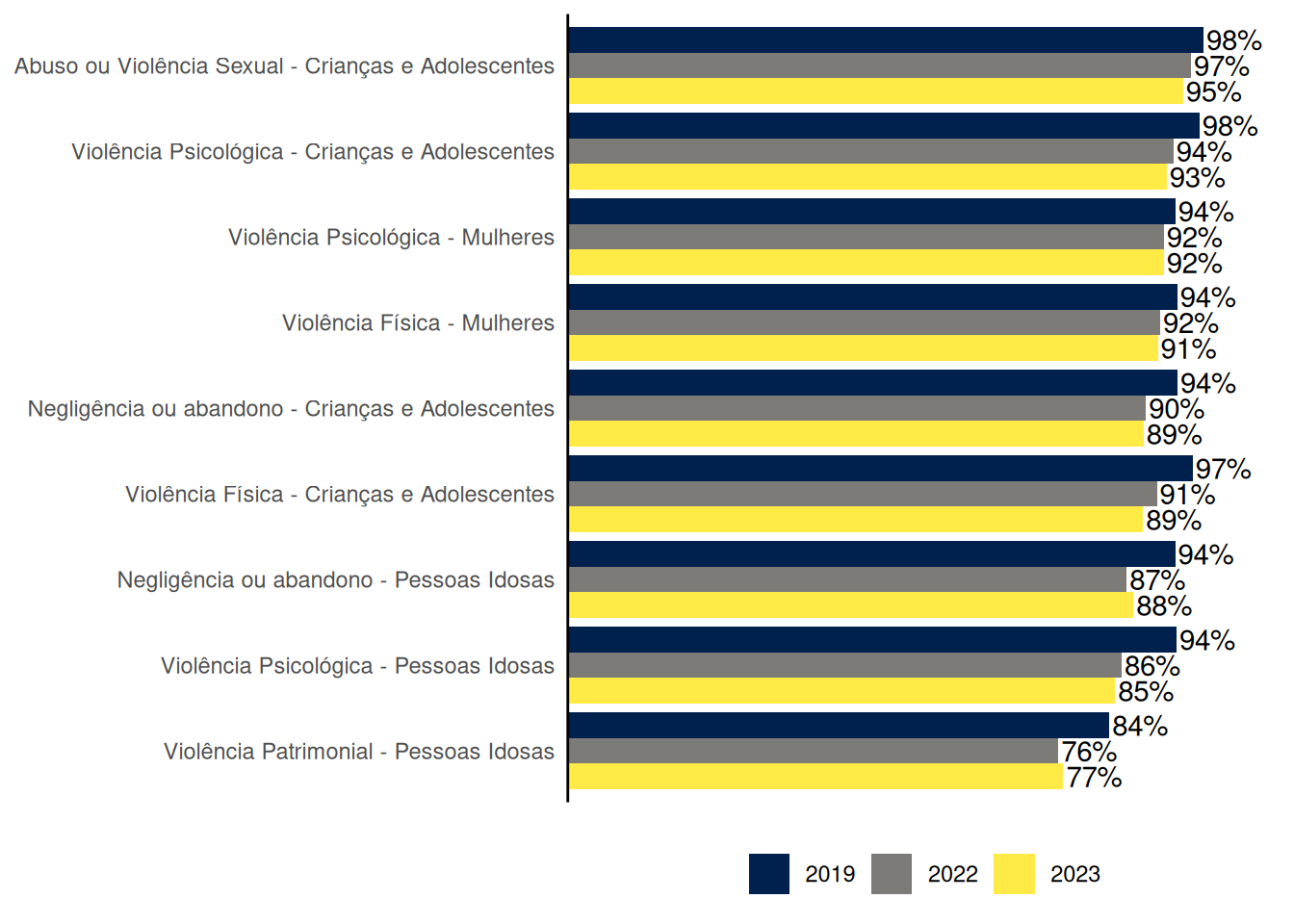 O Gráfico 4.5 mostra as situações e perfis com os maiores percentuais de CREAS que relataram ter realizado atendimento nessas situações e perfis em 2023. Todos os percentuais deste gráfico caíram em 2023 em relação a 2019, e a maioria caiu também em relação a 2022. As situações e perfis com maiores percentuais de CREAS que realizaram atendimento foram as situações de abuso e violência sexual e as de violência psicológica contra crianças e adolesecente, e as situações de violência psicológica e de violência física contra mulheres, com mais de 90% dos CREAS tendo relatado a realização de atendimentos dessas situações e perfis.