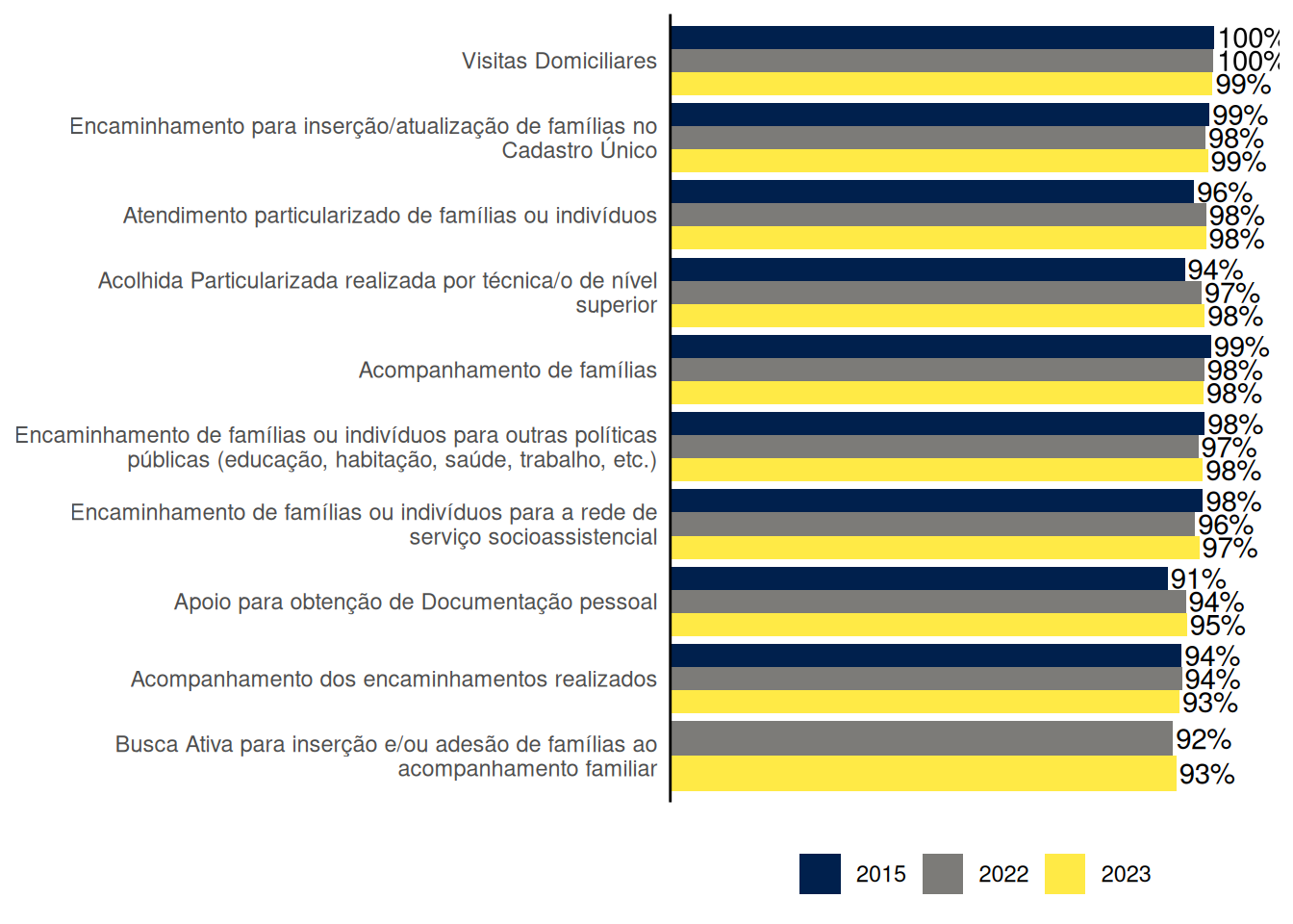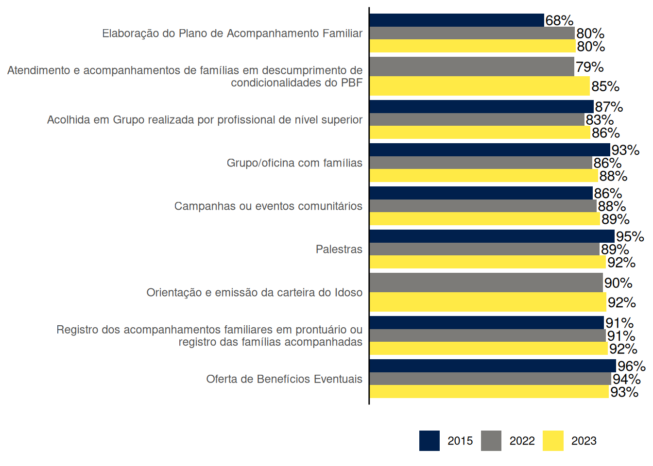 Já o Gráfico 4.2 mostra as atividades no âmbito do PAIF com os menores percentuais de unidades de CRAS que as desenvolviam em 2023, com destaque para a elaboração do Plano de Acompanhamento Familiar, atividade realizada por 80% das unidades de CRAS, e para o registro em prontuário do acompanhamento das famílias, realizado em 2023 por 92% das unidades de CRAS (aumento de 1 ponto percentual em relação a 2022), sendo que o registro do acompanhamento familiar através de prontuário é obrigatório.
